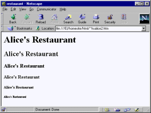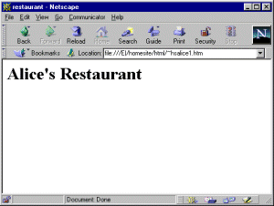 Notice that "Alice's Restaurant" is in large text, as we would perhaps expect. Notice also that the document title appears at the very top of the screen on the title bar. This is not the same as the heading which appeared on the page in large letters. It did that because we put it between opening and closing heading tags, like this: