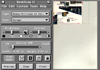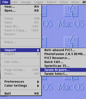 Place your photo to be scanned face down on the ScanJet IIc scanner. Once in Photoshop, go to the FILE menu, scroll down to IMPORT and then to TWAIN ACQUIRE