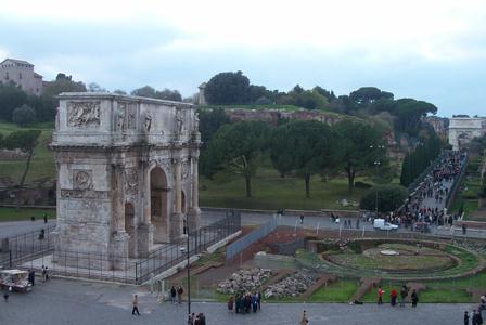 The Arch of Consatntine is just to the left of the Colosseum. Cars used to run through the arch 20 years ago and now it is blocked of and is now viewed by millions of tourist.