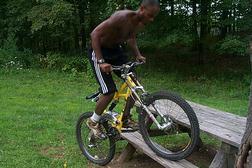 Xavier Paul shows off his bike skills as he rides over the picnic bench.