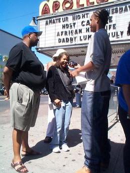 Later in the afternoon I spotted a family of talented women. Danielle Walker, 13, Dominique Walker, 13, their sister Mercedes Walker 16, and their mother Barbara Walker, who didnšt give an age. This family traveled all the way from Long Beach, California to try out for the world famous Apollo. I met many and spoke to most. Mercedes had travelled here with her family because she had been accepted into the Dance Theatre of Harlem. On their way through Harlem, Barbara noticed the line outside of the Apollo and after a few questions she convinced her two younger daughters to try-out. They had been singing since they were little and were excited about their auditions. Stay tuned for follow up stories on the progress of some of the interviewed participants.