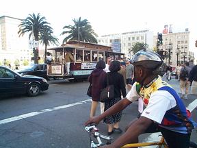 Earlier, Kerly poses near Union Square as cable car approaches.