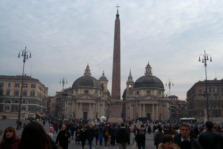 View of the Egyptian obelisk. In the background you see the twin Churches, Santa Maria dei Miracoli and Santa Maria in Montesanto, built by Rainaldi